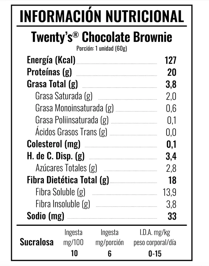 Deliciosas barras sabor fudge de chocolate y bañadas en chocolate negro. Las barras Twenty’s son ideales para quienes buscan incorporar una alta dosis de proteína a su dieta, ya sea porque realizan actividad física o porque buscan cuidar su peso. Contiene 19 gramos de proteína de leche y 15 gramos de fibra. Son libres de ellos, sin azúcar añadida y libres de gluten.